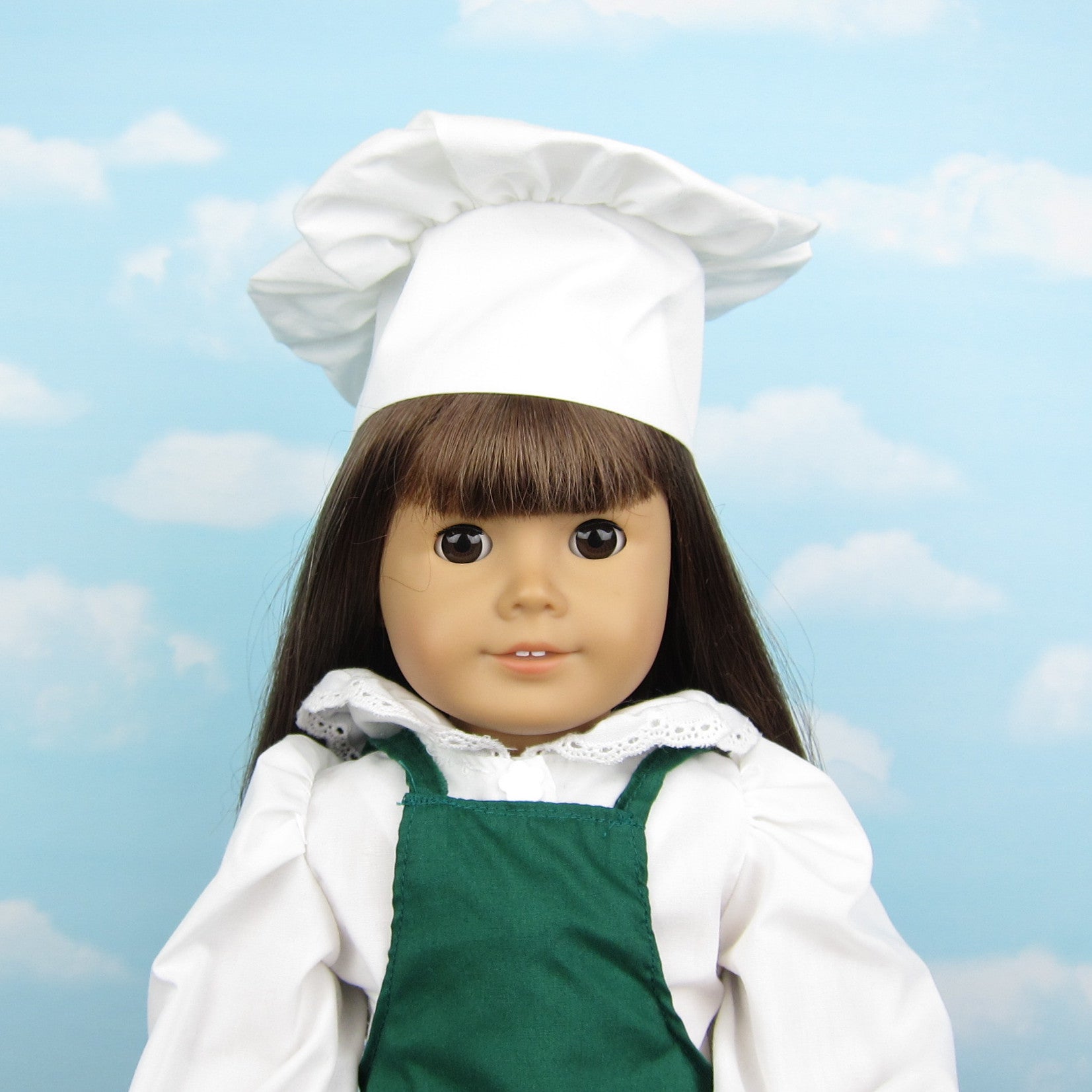 This vintage apron is a fun accessory for your 18-inch doll to wear in the kitchen or garden. The apron is dark green with four large pockets on the front to hold baking utensils or gardening tools. It slips over the head and has straps that tie behind the waist.