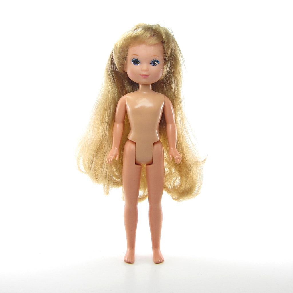 In the early 1980s, Starr and her friends Kelly, Shaun, and Tracy were taller and much more poseable than Barbie. Their necks, shoulders, elbows, wrists, waists, hips, knees and ankles could all bend and twist into more realistic poses. Dazzle dolls were small 4 1/2" fashion dolls with heads made from two different scaled-down Barbie molds.