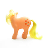 This vintage G1 My Little Pony is Applejack. She's orange with yellow hair and white freckles on her face. Her symbol is 7 red apples with green leaves. This version of her was released in Year 2 and has shorter hair than the Year 3 version.