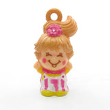 This vintage Charmkins set is Bouncing Bet and Half an Inchworm. Bouncing Bet is a cheerful girl with pink striped pants and Half an Inchworm is a green worm with wheels that really turn. Bouncing Bet attaches to a peg on his back. The Bouncing Bet and Half an Inchworm set originally came with a pink name tag keychain hanger, but that piece is missing.